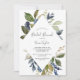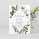 Cette invitation de brunch à la nuptiale verte automne est parfaite pour une douche mariage de automne. Le design rustique moderne présente des feuilles bleu marine, vert sauge et or avec des branches de fleurs bleu foncé.