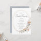Voici notre invitation de brunch pour une douche de mariée bohème rustique — où l'élégance intemporelle rencontre la chaleur de la palette enchanteresse de l'automne. Imaginez : un fond blanc immaculé qui met en scène cette invitation. Un cadre ovale doré contient le texte, orné d'un bouquet rustique de fleurs sauvages délicates aquarellées en rose, bleu, pêche, blanc crème et jaune doux, avec des touches subtiles de feuillage vert sauge. Le dos est un bleu poussiéreux en détresse. Cette invitation est plus qu'une simple annonce ; c'est une œuvre d'art qui reflète la romance et le charme de votre jour spécial. Créé par Simply Farmhouse Press.