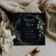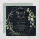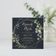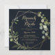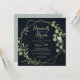 Ce brunch vert or géométrique avec invitation à la douche à la mariée est parfait pour un wedding shower tropical. Le design présente de beaux feuilles verts peints à la main dans un arrière - plan bleu foncé, ornant un cadre géométrique doré.