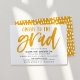 Invités Invitations à votre fête de remise de diplômes avec nos invitations chic et branché Cheers to Grad graduation ! Les invitations modernes de la fête de remise de diplômes mettent en vedette l'expression "Cheers to the grad" dans un script de pinceau jaune doré, écrit à la main, avec les détails de votre fête affichés ci-dessous. Les invitations de la fête de remise de diplômes renversent vers un motif abstrait jaune et blanc en or. Parfait pour les fêtes de fin d'études secondaires et collégiales !