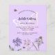 Un arrière - plan violet, couleur lavande. Décoré d'abeilles et de fleurs sauvages peints en violet et rose et d'un grand papillon. Personnalisez et ajoutez un nom et des détails du parti. 1 feuille = 1 invite imprimé bord à bord.