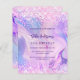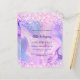 Une invitation à la fête d'anniversaire de 18e anniversaire, féminine et féminine (ou tout âge). Devant : Un arrière - plan de couleur holographique en violet, rose. Décoré de confettis rose vif. Personnalisez et ajoutez un nom et des détails du parti. Le nom est écrit avec un script de style écrit à la main, des lettres de couleur violette. 1 feuille = 1 invite imprimé bord à bord.