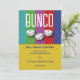 Couleurs rétro amusantes et colorées Invitation Bunco. La typographie moderne avec trois dés de Bunco chanceux. Joueurs Invitations à une soirée amusante de dés, de dîner et de boissons. Continuez !
