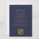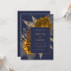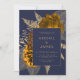 Cette faire-part de mariage élégante et moody présente un bouquet luxuriant et romantique à fleurs, orangé et rouille, avec fausse feuille d'or et feuillage de parties scintillant sur un arrière - plan bleu marine. Customisez le texte de couleur or dans des polices stylisées sur un rectangle bleu marine. L'envers offre de l'espace pour les détails mariages sur un arrière - plan bleu marine solide, ainsi qu'un code QR que les invités peuvent scanner pour visiter votre site Web et RSVP, qui économise le coût d'impression et d'envoi de cartes RSVP séparées.