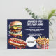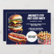 Un graphisme d'aquarelle éclatant et amusant avec un cheeseburger à double patte avec de la laitue, du fromage fondu, du ketchup et de la moutarde ; un hot dog avec des oodles de sauce et une boîte rayée rouge et blanc avec des frites dans le tout dressé contre un arrière - plan bleu foncé qui a éditable des modèles de texte blanc sur lui pour votre libellé personnalisé. Cette conception est idéale pour une "restauration rapide", "junk food", "in n out burger" ou "build your own" food truck thème de la retraite, anniversaire, cerf ou bachelor bash ou un événement d'affaires.