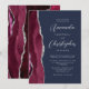 Le bord gauche de cette élégante faire-part de mariage moderne est orné d'une bordure d'aquarelle rouge bordeaux et ornée d'une parties scintillant en faux argent. Le texte personnalisable combine des polices de script et sans serif en gris argenté sur un arrière - plan bleu marine. L'envers est assorti d'un design d'agate bordeaux et argenté.