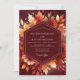 A rich tapestry of autumnal leaves in deep reds, oranges, and golden hues creates a warm, vibrant backdrop. This design evokes the cozy, romantic atmosphere of a fall celebration.