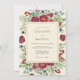 This design features a rich tapestry of deep red blossoms and variegated green foliage, accented with scattered dark berries. The artwork evokes a sophisticated, natural elegance, perfect for a refined autumnal or winter celebration. The lush botanical arrangement creates a captivating and organic border.