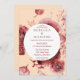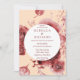 Un joli design faire-part de mariage, il ya des fleurs bordeaux dessinés main dans une belle façon. L'arrière - plan est la pêche et le centre dispose d'un espace circulaire pour personnaliser vos informations. La police est de couleur bordeaux. Sur le dos se trouve un graphique floral bordeaux. Personnalisez votre faire-part de mariage aujourd'hui !