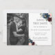 Mettez en valeur votre photo de pré-mariage avec cette carte de photo d'enregistrement de date chic bohème. Avec une belle couronne de fleurs et de feuillage de greenery dans des tons aquarelle burgundy, navy et blush. Personnalisez-la facilement et rapidement avec vos détails, il suffit d'appuyer sur le bouton personnaliser pour réorganiser et formater le style et l'emplacement du texte.