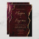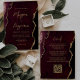 Cette élégante invitation de mariage présente une image arrière - plan d'agate d'aquarelle rouge bordeaux, parée de parties scintillant en faux or. Le texte personnalisable combine écriture manuscrite moderne couleur or, cuivre et polices italiques. L'envers offre de l'espace pour les détails mariages sur un arrière - plan agate bordeaux correspondant, ainsi qu'un code QR que les invités peuvent scanner pour visiter votre site Web et RSVP, ce qui permet d'économiser le coût d'impression et d'envoi de cartes RSVP séparées.