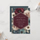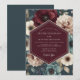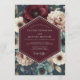 This artistic design evokes a dramatic and romantic mood. A beautiful arrangement of deep burgundy peonies, ivory anemones, and rich teal blossoms is set against a dark, shadowy backdrop. The painterly bouquet creates a sophisticated and timeless feel for an elegant union. This rich, moody palette is perfect for an evening affair.
