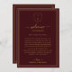 A burgundy wedding welcome letter and itinerary card featuring an elegant gold crest monogram, refined borders, and a classic layout. The rich palette and timeless detailing create a warm, sophisticated introduction to your wedding weekend. Perfect for formal, evening, or fall celebrations, this card provides guests with essential information while adding a polished, coordinated touch to your wedding suite.