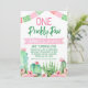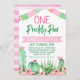 Pink Green Cactus One Prickly Pair Anniversaire Invitation Jeune fille jumelle fêtera l'invitation d'anniversaire sur le thème de la fête avec quelques cactus, une bannière rose et des drapeaux de bunting. Cette invitation d'anniversaire de fiesta ou cactus une paire de nausées est prête à être personnalisée.