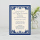 Élégantes invitations pour 50e anniversaire de mariage. Une invitation traditionnelle pour 50e anniversaire de mariage avec un design de défilement vintage bleu marine et un fond crème. Illustration par © Mujka Design