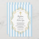 Invitation de baptême avec un fond rayé bleu et blanc avec une croix dorée et un cadre pour un baptême de garçon