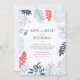 Cadre de fleurs et de feuilles tropicales en bleu marine avec un cadre rouge corail, modèle d'invitation personnalisable pour annoncer la date de votre mariage.