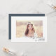 Une invitation simple et chic à la remise des diplômes de photographie présente votre portrait ou photo de diplôme préféré encadré par une épaisse bordure blanche, avec le nom du diplômé sur le coin inférieur droit. Personnalisez avec votre année de classe et votre école en dessous, et ajoutez les détails de votre invitation à la fête de remise de diplômes au verso en blanc sur une ardoise bleu-gris arrière - plan.