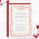 Cette élégante invitation de fête de couple présente un cadre de baie rouge aquarelle avec un charmant nœud rouge et une typographie stylée.