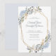 Faire-part de mariage à cadre géométrique doré avec fleurs et feuilles de bleu poussiéreux aquarelle romantique. Ajoutez vos détails de mariage à cette invitation de couronne botanique moderne. Ce design élégant est idéal pour les mariages de printemps et d'été.