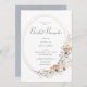 Voici notre invitation de brunch pour une douche de mariée bohème rustique — où l'élégance intemporelle rencontre la chaleur de la palette enchanteresse de l'automne. Imaginez : un fond blanc immaculé qui met en scène cette invitation. Un cadre ovale doré contient le texte, orné d'un bouquet rustique de fleurs sauvages délicates aquarellées en rose, bleu, pêche, blanc crème et jaune doux, avec des touches subtiles de feuillage vert sauge. Le dos est un bleu poussiéreux en détresse. Cette invitation est plus qu'une simple annonce ; c'est une œuvre d'art qui reflète la romance et le charme de votre jour spécial. Créé par Simply Farmhouse Press.