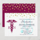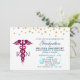 Invitation pour une célébration de fin d'études d'infirmière. Conçu avec des points de confettis dorés faux le long du haut. Un symbole de caducée rouge violacé avec les lettres R N de chaque côté. Un stéthoscope bleu pastel derrière le texte de la fête.