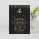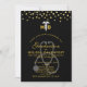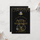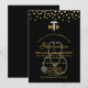 Une invitation pour une célébration de remise de diplôme de docteur en médecine. Conçue avec des points de confettis en faux or le long du haut. Un symbole de caducée blanc avec les lettres M D de chaque côté. Un stéthoscope gris derrière le texte de la fête.