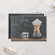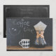 Invitation à une réunion / fête sur le thème du café. Un tableau noir à l'arrière indique "c'est l'heure du café" avec un visage souriant, écrit à la craie. À l'avant, sur une table en bois rustique, se trouve une tasse à café avec un motif de diamants en noir et blanc. À côté de la tasse à café se trouve une cafetière avec un grand filtre et une cafetière fraîchement préparée. Apparence rustique et démodée. Le dos de l'invitation est personnalisable pour que vous puissiez y mettre tous les détails de votre fête, sur un design à texture de tableau noir.