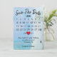 "Calendrier de sauvegarde de la date" avec un cœur rouge sur un design de phare à l'aquarelle et d'océan pour un mariage à venir.