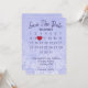 Calendrier "Sauvez la date" avec un cœur rouge sur un motif de flocons de neige violet pastel pour un mariage à venir.