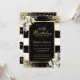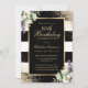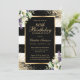 Elégante invitation à 80ème anniversaire rayée noir et blanc avec cadre doré décoré de confettis d'or, lys calla et verdure.