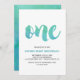 Cette carte d'invitation de premier anniversaire de calligraphie aquarelle est parfaite pour une fête d'anniversaire d'été pour garçons. Le design amusant et énergique est composé d'une police de script d'aquarelle vert turquoise et bleu aqua ombre.