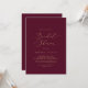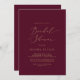 Cette délicate calligraphie or burgundy invitation à la douche nuptiale est parfaite pour un wedding shower moderne. Le design minimaliste romantique présente une belle et élégante typographie de champagne jaune doré sur un arrière - plan rouge bordeaux à l'allure simple et épurée.