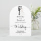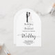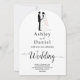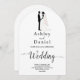 Cette élégante faire-part de mariage en arc noir et blanc est parfaite pour un mariage moderne. Le design simple présente une élégante calligraphie noire et une illustration de mariée et de mariée sur un arrière - plan blanc propre. La carte d'invitation comprend les détails du mariage au dos au lieu de payer une carte d'enceinte séparée.