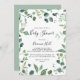 Ce script de calligraphie vert feuillage invitation baby shower est parfait pour un baby shower moderne. Le design se compose d'aquarelle dessinée à la main d'élégantes branches d'eucalyptus botaniques et de feuilles, disposés en de beaux bouquets et motifs géométriques.