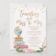 Calligraphie Voyager Mlle à Mme Bridal Shower Invitation Calligraphie moderne douce faux or cuivre et or rose voyage de Miss à Mme nuptiale invitation à la douche avec un soupçon d'un grand arrangement floral audacieux au fond, une ligne de calligraphie décorative moderne brosse, trois valises et un globe mondial. Cette invitation à la douche nuptiale de voyage comporte également quelques points faux en cuivre et une carte vintage à l'arrière et est idéale pour toute personne à la recherche d'un invitation nuptiale moderne.