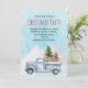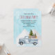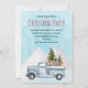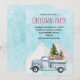 Une invitation à une fête de Noël avec un design festif. Un camion à l'aquarelle transportant des arbres de Noël pins ainsi que des animaux de la forêt. Un ours, un renard et un cerf debout à l'arrière profitant de la balade. Des montagnes enneigées en arrière-plan.