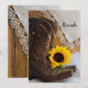 Invitez vos invités à célébrer les jeunes mariés le matin après leur cérémonie de mariage avec la charmante invitation Country Sunflower and Lace Post Western Wedding Brunch. Cette invitation personnalisée de style ranch, élégante et décontractée, pour le petit-déjeuner ou le déjeuner après le mariage, présente une photographie florale charmante de bottes de cowboy en cuir brun, de fleurs de tournesol jaune, de voile de mariée blanc et de mouchoir en dentelle couleur crème blanc cassé avec une bordure rustique sur un fond en bois de grange brun patiné. Une source d'inspiration parfaite pour une fête de célébration informelle dans une grange.