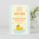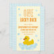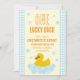 Un canard chanceux ! Premier anniversaire avec canard en caoutchouc et bulles contre un en vichy bleu clair et arrière - plan jaune pâle avec texte orange