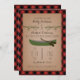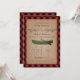 faire-part de mariage illustrant deux branches d'arbres à feuillage persistant et un canot vert. Le Arrière - plan est rouge et le plaid noir. Personnalisez le texte.