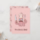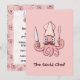 Caricature du chef calmar rose avec moustache tenant couteau et fourche à cuisine. Couleur arrière - plan personnalisée. Texte avant personnalisé. Champs de texte personnalisés et motif sans couture à l'arrière.