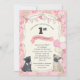 Carlin chien chiot invitation à la fête d'anniversaire sur le thème de la couleur rose pastel et salle pour 2 photos sur le dos.