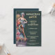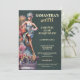 Une invitation élégante pour un carnaval masqué mettant en vedette une showgirl de couture saisissante ornée de plumes, de fleurs et de détails complexes. Placée sur un fond damassé sarcelle foncé, la conception est rehaussée d'une typographie dorée riche pour une finition raffinée et haut de gamme qui signale immédiatement une célébration masquée sophistiquée.