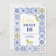 Notre motif de carreaux en céramique bleue italo-méditerranéen audacieux et amusant, associé à des citrons jaunes et verts peints à la main et gais, crée une invitation de fête d'anniversaire Sweet 16 fraîche et moderne qui est sûre d'impressionner ! Avec un cadre mosaïque moderne et une écriture au pinceau élégante. Impressionnez vos invités avec ce design tendance et unique qui fera parler tout le monde ! Ajoutez votre photo au verso.