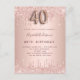 Une invitation moderne, élégante et glamour pour une fête de 40e anniversaire. Un faux rose or à l'apparence métallique arrière - plan avec une élégante parties scintillant d'or faux rose goutte à goutte, peinture goutte à goutte. Le nom est écrit avec un rose moderne de couleur or foncé à la main écriture style. Personnalisez et ajoutez les détails de votre fête. Le numéro 40 est écrit avec une police de style ballon, script. Conseil : Si vous ne voulez pas qu'il ressemble à une carte postale, cliquez sur customiser, allez à l'arrière et retirez le séparateur et le timbre postal.