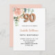 Une élégante invitation à une fête du 90e anniversaire. Un arrière - plan blanc chic. Décoré d'or rose et de rose pastel rose vif, de fleurs roses, de feuilles d'eucalyptus verts, de sprigs, de verdure et de faux sprigs d'or. Personnalisez et le nom et les détails du parti. Lettres noires et dorées. Le nom est écrit avec un script de style moderne écrit à la main. Le numéro 90 est écrit avec une police de style ballon doré. Retour : Couleur arrière - plan rose or, design carte postale.