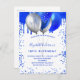 Un arrière - plan blanc. Décoré avec la fausse parties scintillant bleue royale gouttes de peinture goutte à goutte, scintille. Ballons Royal bleu et faux argent. Personnalisez et ajoutez un nom et des détails du parti. Le nom est écrit avec un script de style écrit à la main.