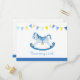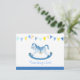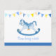 Carte postale pour une baby shower pour garçon "Apportez un livre" dans les tons de bleu et de jaune. Parfaite pour les fêtes de baby shower où vous souhaitez que vos invités apportent un livre pour créer une bibliothèque. Quelle meilleure façon de souhaiter la bienvenue à votre nouveau-né dans le monde que de lui montrer combien il est aimé par vos amis et votre famille. Des cadeaux souvenirs très spéciaux pour vous et votre bébé garçon pour les années à venir. Peinture aquarelle cheval à bascule et design par Sarah Trett pour www.mylittleeden.com