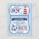 C'est un garçon ! Cute, phare, ancre et sauvetage nautique thème garçon baby shower invitation sur les bandes bleues et blanches motif. Le phare rouge et blanc sur l'eau ondulée de l'océan, les sauveteurs rouges et blancs et l'ancre de bateau bleu. Les couleurs comprennent le rouge, la marine, le bleu royal, le blanc et le bleu ciel. invitation vintage en forme de support.