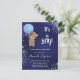 Pour un baby shower célébrant un bébé garçon. Arrière - plan bleu marine, la couleur bleue est inégale. Décoré avec de la poussière de parties scintillant en faux argent. Un ours en peluche tenant un ballon bleu clair. Personnalisez et ajoutez le nom de la mère à être et les détails de la fête. Le nom et le texte : It's a Boy! sont écrits avec un script de style écrit à la main. Retour : conception de carte postale. Conseil : Si vous ne voulez pas qu'il ressemble à une carte postale, cliquez sur customiser, allez à l'arrière et retirez le séparateur et le timbre postal.